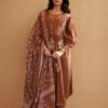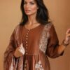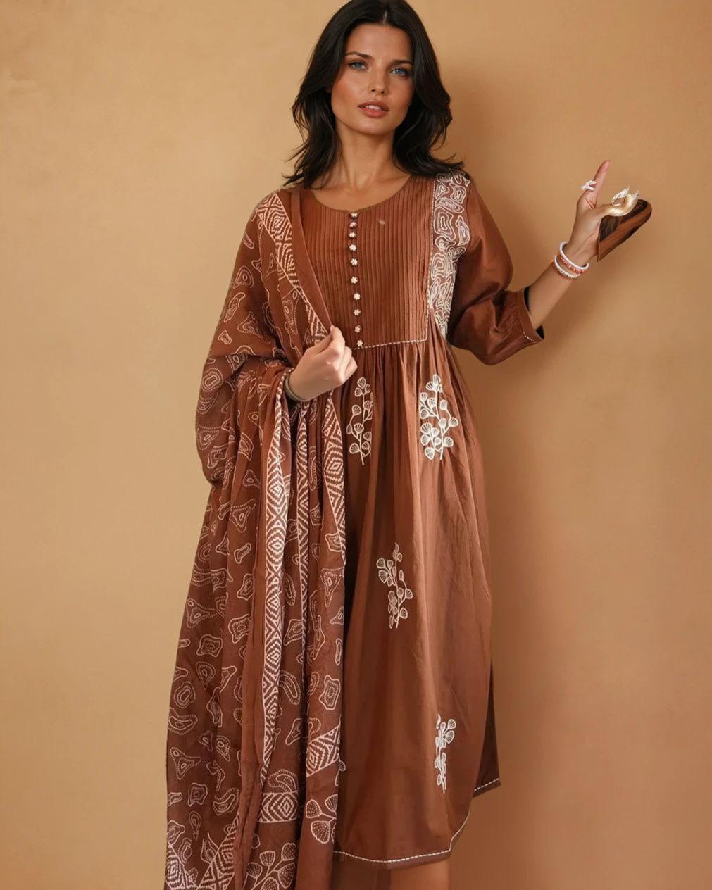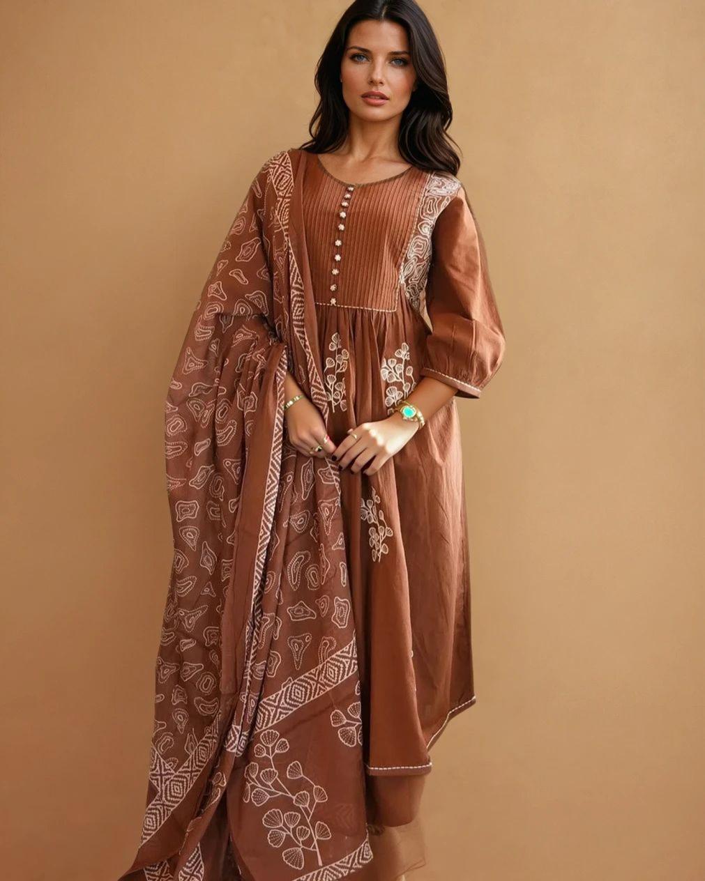 Step into timeless elegance with our New Anarkali Kurta Set, crafted in a rich earthy brown shade. Designed with a tiered pattern for a graceful flare, this set includes: