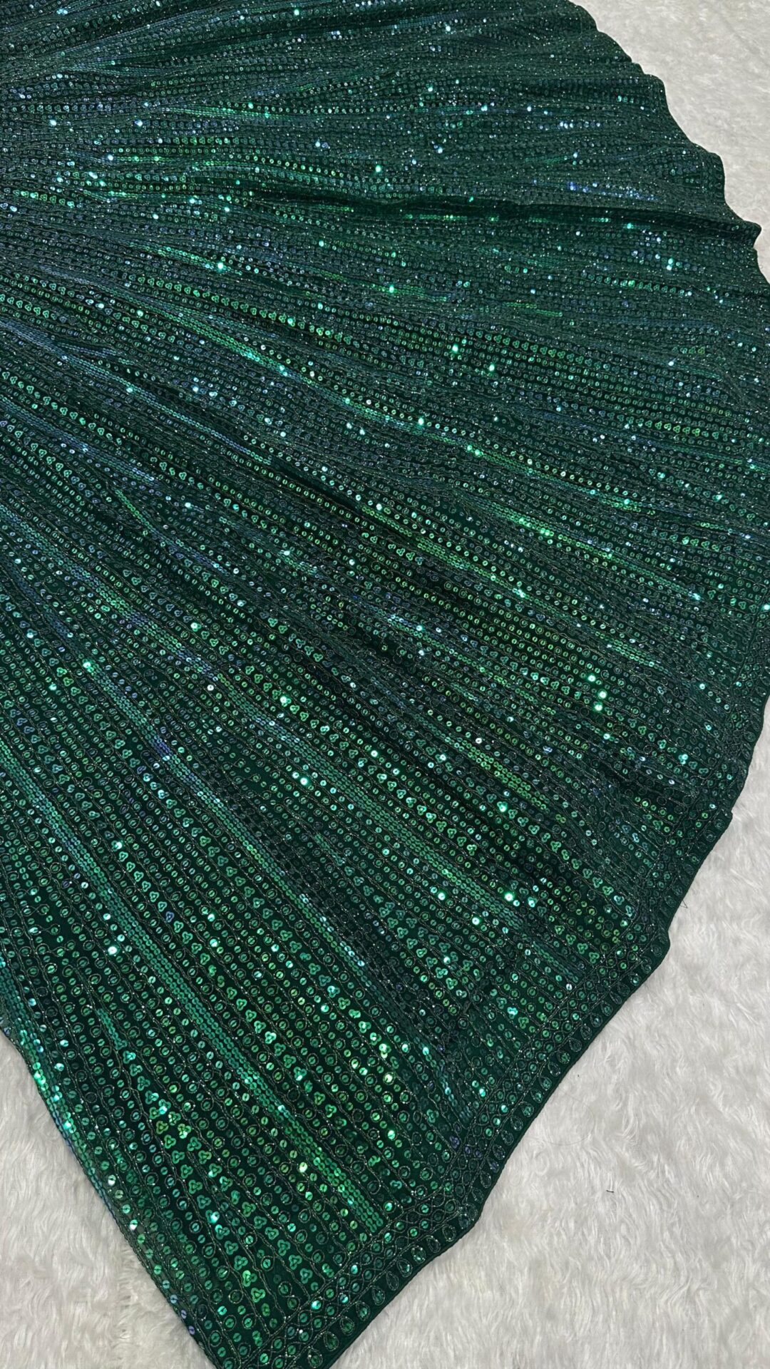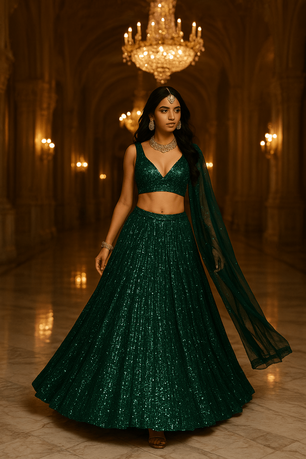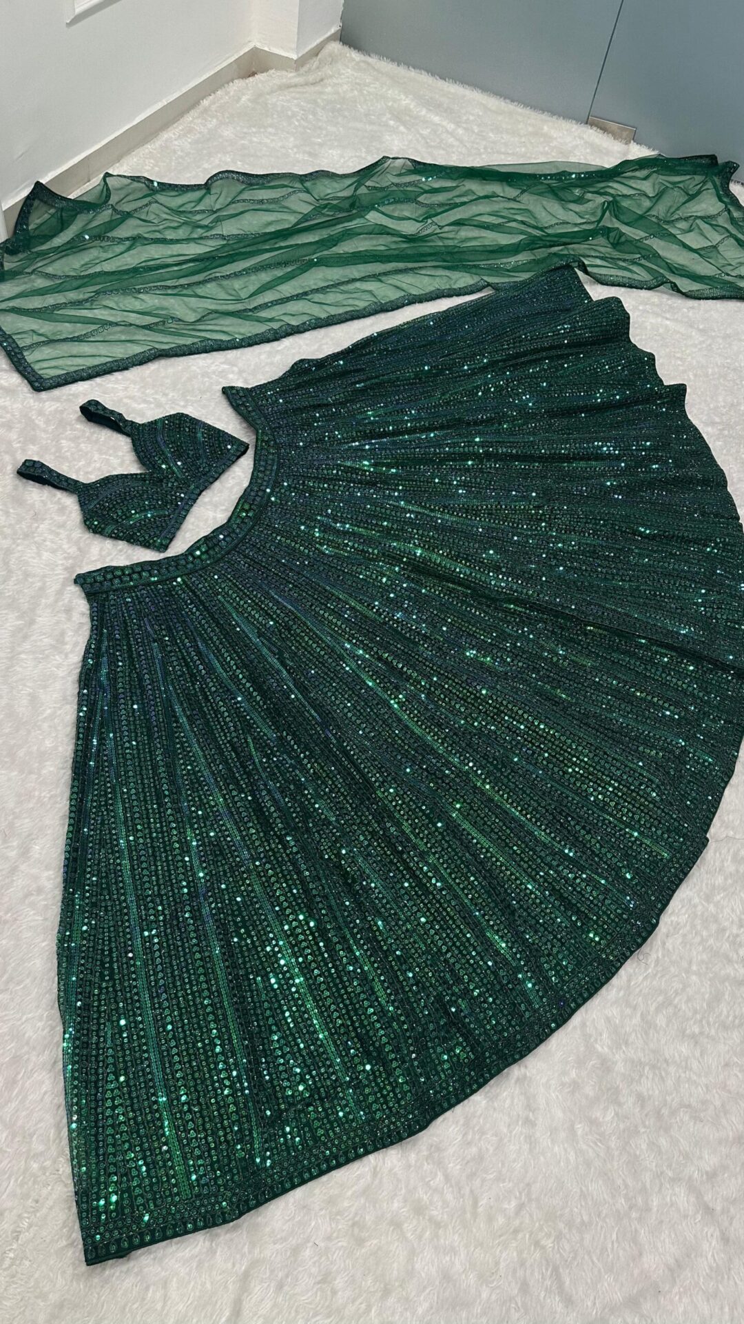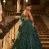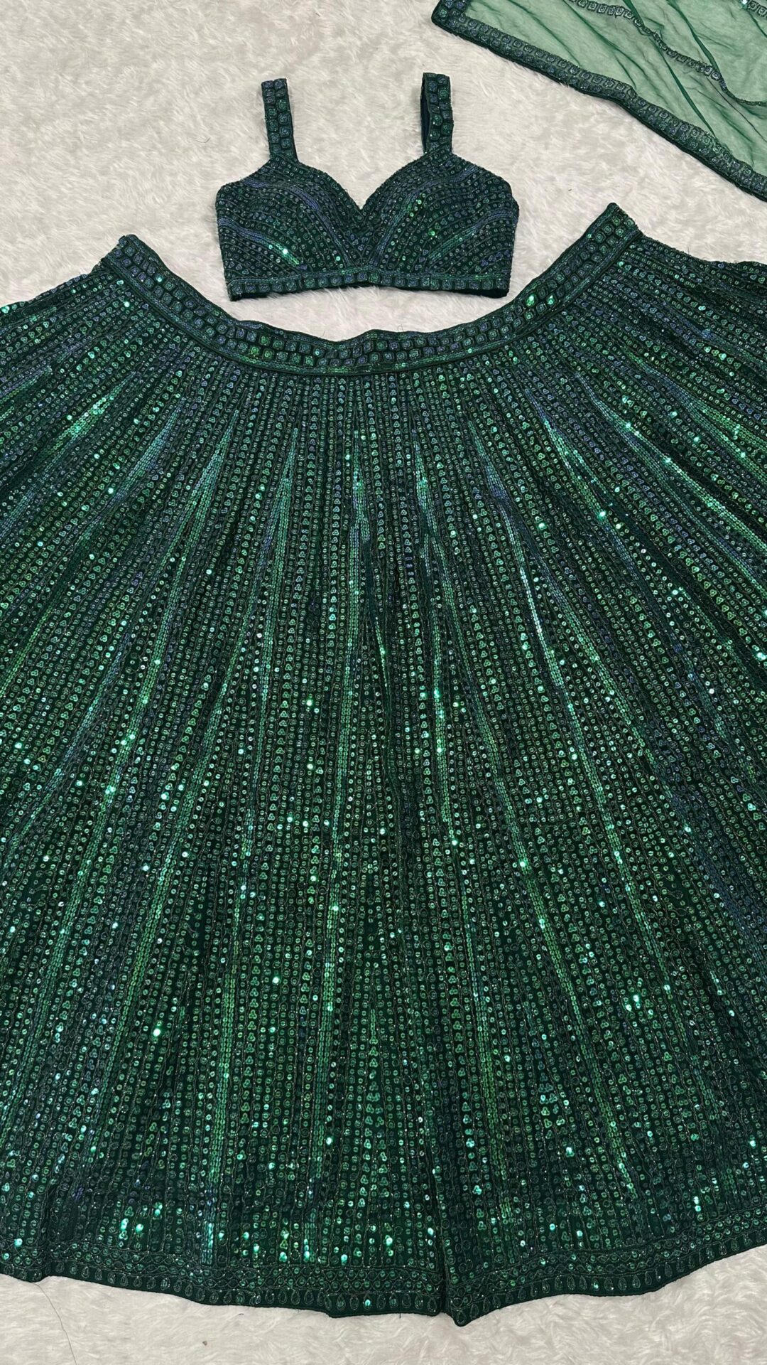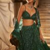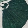 Turn heads with this stunning Emerald Green Rainbow Sequin Net Lehenga Set, designed to make every occasion memorable. The luxurious net fabric adorned with rainbow sequins and intricate dori work reflects sophistication and glamour.