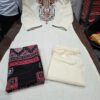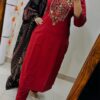 The set comes with matching maroon pants for a sleek and modern appeal, complemented by a black printed dupatta that adds contrast and completes the ethnic look. Whether you’re heading to a family gathering, festive celebration, office, or a casual outing, this versatile ensemble will keep you looking sophisticated and chic. Pair it with ethnic juttis and statement jewelry for a complete traditional look.