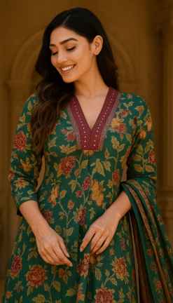Step into everyday elegance with this beautiful green floral Anarkali set, tailored from a soft cotton blend for comfort and style. The kurta, bottomwear, and dupatta all feature a matching green hue, enhanced with a vibrant floral print that exudes grace and charm. Designed with a round neck, three-quarter regular sleeves, and an ankle-length flared silhouette, it offers a flattering fit while ensuring ease of movement.