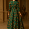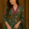 Step into everyday elegance with this beautiful green floral Anarkali set, tailored from a soft cotton blend for comfort and style. The kurta, bottomwear, and dupatta all feature a matching green hue, enhanced with a vibrant floral print that exudes grace and charm. Designed with a round neck, three-quarter regular sleeves, and an ankle-length flared silhouette, it offers a flattering fit while ensuring ease of movement.