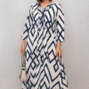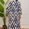 Elevate your everyday style with this stunning navy and white geometric print maxi dress. Designed with a flattering A-line silhouette, it flows gracefully to provide both comfort and elegance. The dress features a V-neckline adorned with delicate embroidery and bead accents, adding a touch of sophistication. Crafted from soft, breathable cotton fabric, it’s perfect for casual outings, brunch dates, or vacation wear. The 3/4 sleeves provide modest coverage while ensuring ease of movement, and the geometric pattern offers a modern, chic vibe. Pair it with heels or flats for a versatile look.