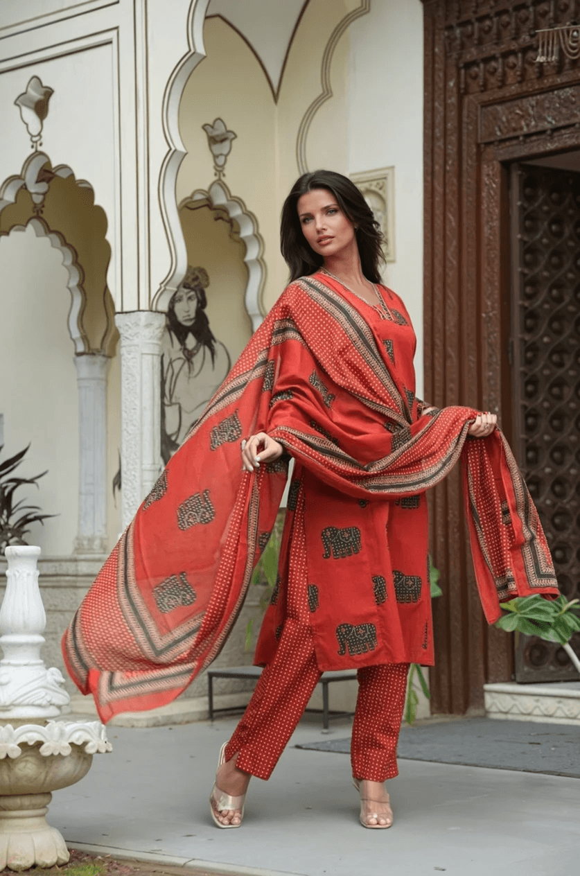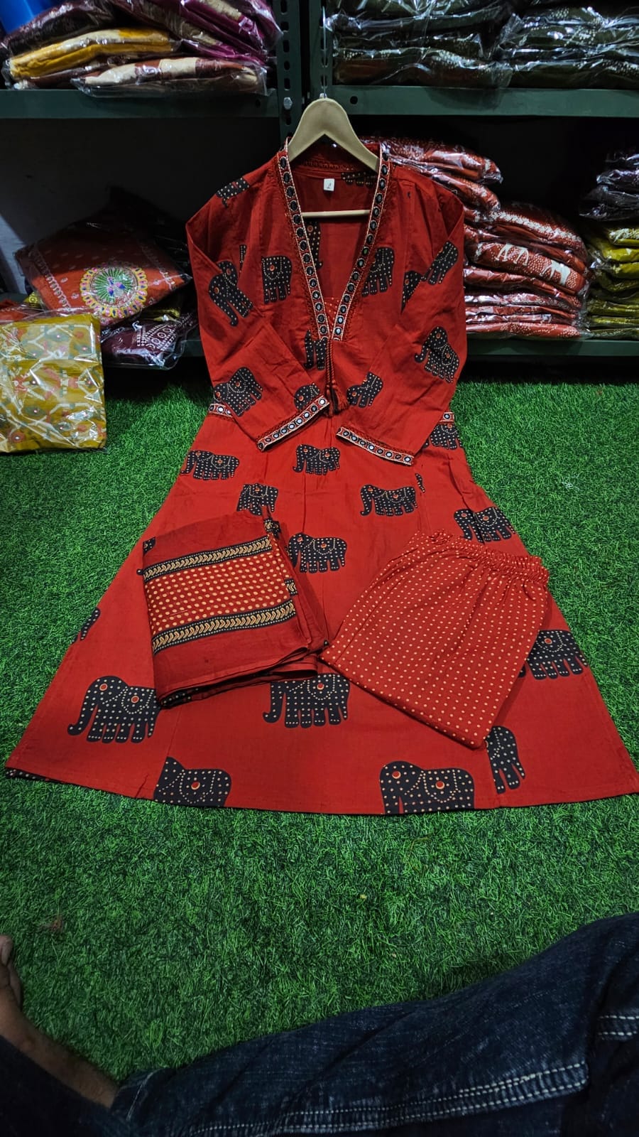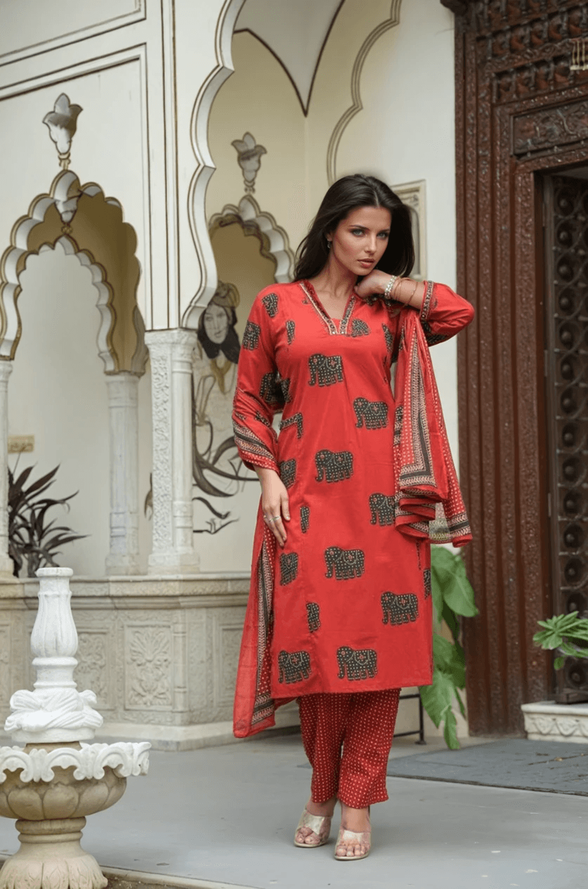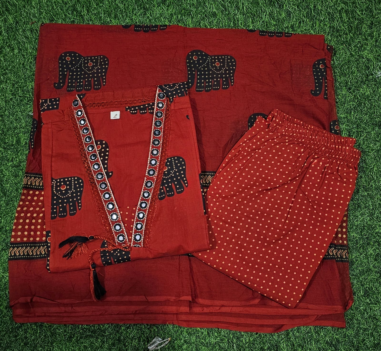 This stunning Red Elephant Print Kurti Set is crafted in breathable cotton, adorned with elegant elephant motifs and highlighted with tubelight and sequin work on the neckline. The set includes a 46-inch kurti, 38-inch pants, and a 2.1-meter dupatta. Both sets come with matching printed pants and dupattas, offering a complete festive or casual day-wear look.